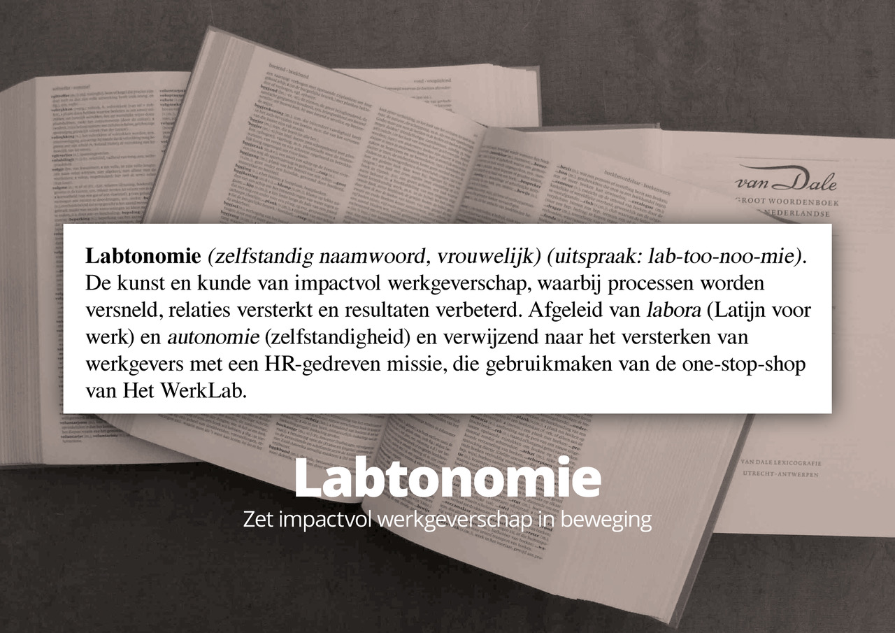 Een merkconcept laden lukt alleen als het een verhaal is vanuit de kern van de organisatie. Voor Het WerkLab bedachten we een eigen woord die zij volledig kunnen claimen: Labtonomie. Hier komen de kunst en kunde van impactvol werkgeverschap samen met het versterken van werkgevers, die gebruik maken van de one-stop-shop van Het WerkLab. Hiermee heeft Het WerkLab iets in handen wat geen enkel andere organisatie heeft.